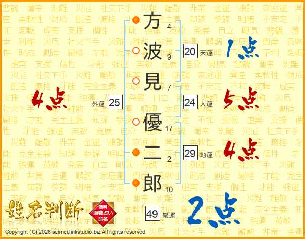方(4画)波(9画)見(7画) 優(17画)二(2画)郎(10画)