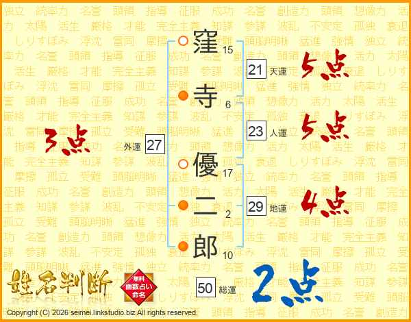 窪(15画)寺(6画) 優(17画)二(2画)郎(10画)