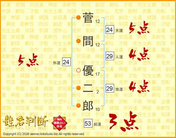 菅(12画)間(12画) 優(17画)二(2画)郎(10画)