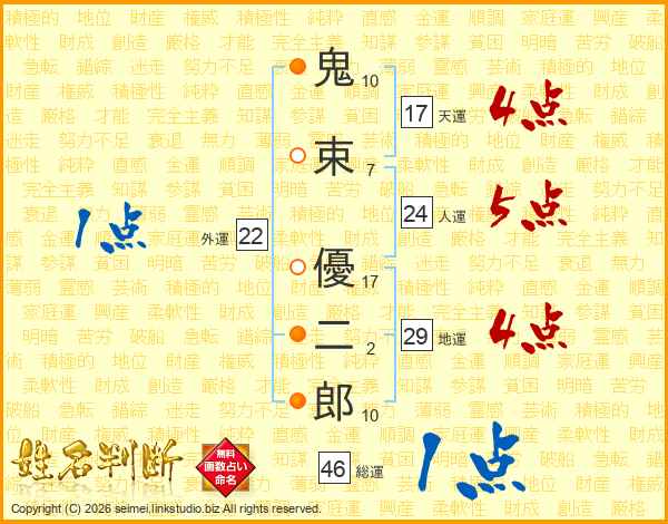 鬼(10画)束(7画) 優(17画)二(2画)郎(10画)