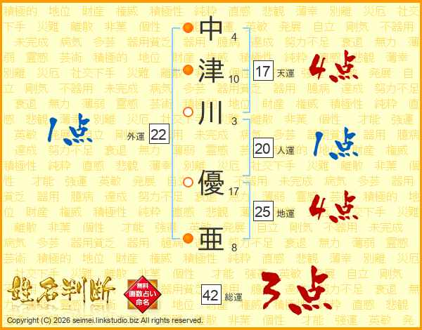 中(4画)津(10画)川(3画) 優(17画)亜(8画)