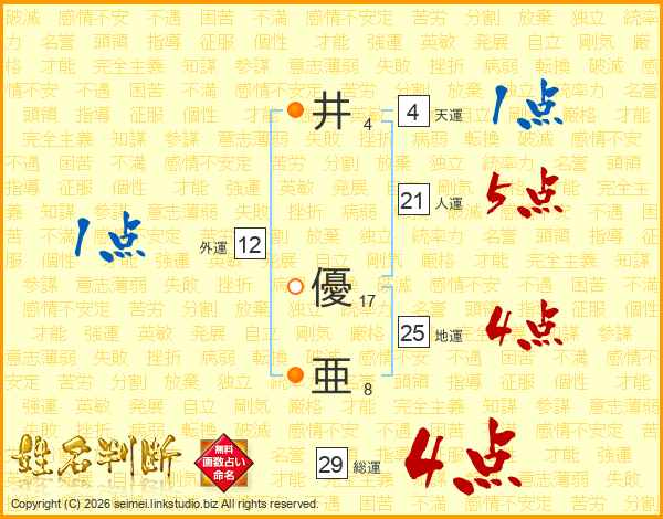 井(4画) 優(17画)亜(8画)