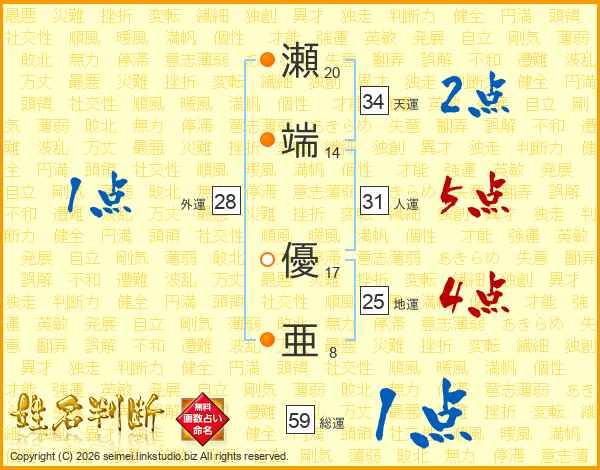 瀬(20画)端(14画) 優(17画)亜(8画)