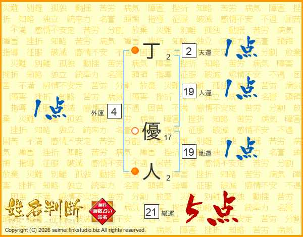 丁優人さんの総運は21画の5点!