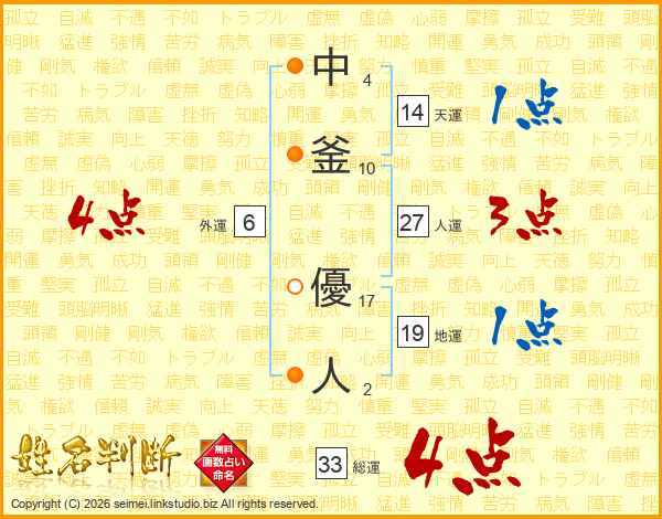 中釜優人さんの総運は33画の4点!