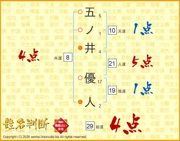 五(5画)ノ(1画)井(4画) 優(17画)人(2画)