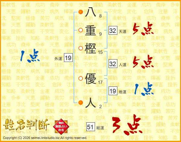 八(8画)重(9画)樫(15画) 優(17画)人(2画)