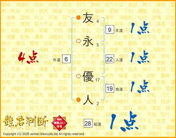 生活面を象徴する運勢です。外部から受ける影響力を表し、結婚運、家庭運や職場、環境への順応性を表します。総運から人運を引いた画数。姓や名が1文字の場合を除く。