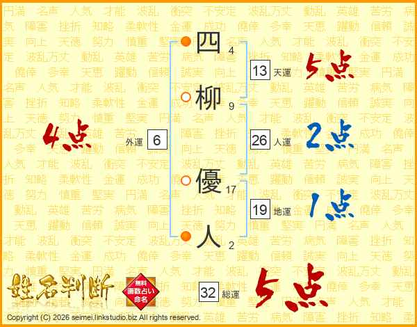 生活面を象徴する運勢です。外部から受ける影響力を表し、結婚運、家庭運や職場、環境への順応性を表します。総運から人運を引いた画数。姓や名が1文字の場合を除く。
