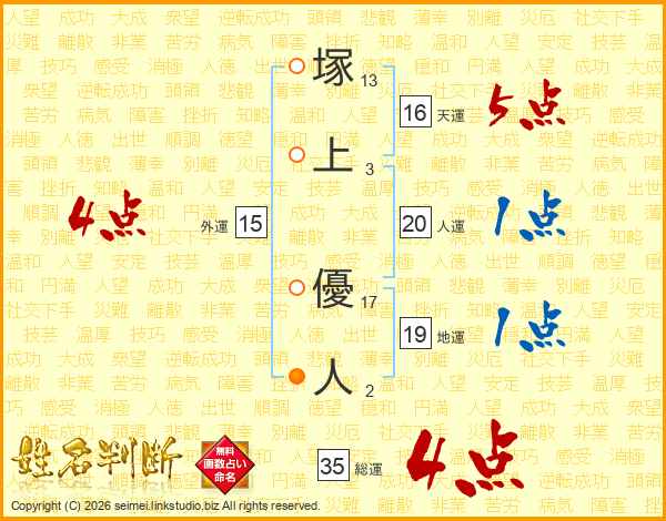 塚上優人さんの総運は35画の4点!