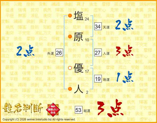 あなたの人生を表す1番重要な運勢です。生涯を通じて影響する総合運となり、主に50歳以降の晩年期に影響を及ぼします。苗字と名前の合計画数。