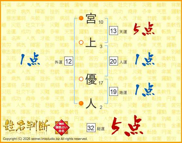 生活面を象徴する運勢です。外部から受ける影響力を表し、結婚運、家庭運や職場、環境への順応性を表します。総運から人運を引いた画数。姓や名が1文字の場合を除く。