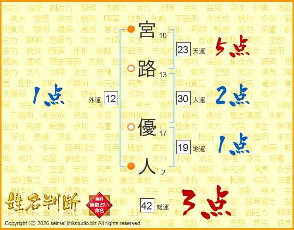 宮(10画)路(13画) 優(17画)人(2画)