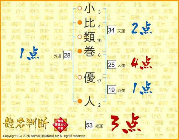 小(3画)比(4画)類(19画)巻(8画) 優(17画)人(2画)