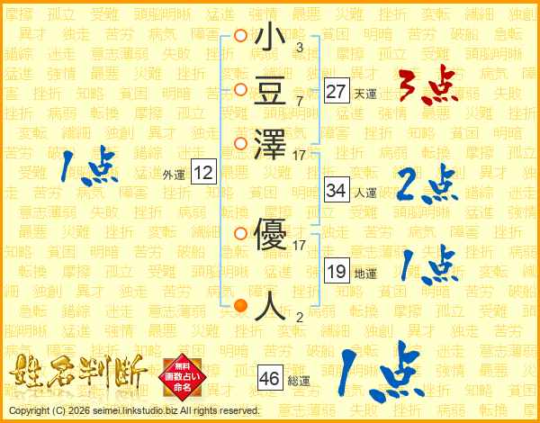 小(3画)豆(7画)澤(17画) 優(17画)人(2画)