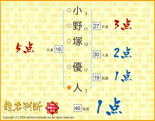 小(3画)野(11画)塚(13画) 優(17画)人(2画)