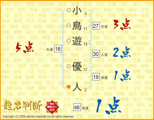 小(3画)鳥(11画)遊(13画) 優(17画)人(2画)