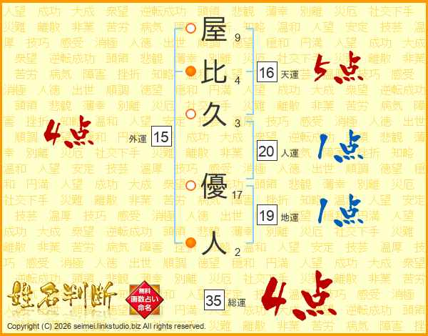 屋(9画)比(4画)久(3画) 優(17画)人(2画)