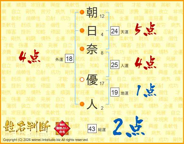 朝(12画)日(4画)奈(8画) 優(17画)人(2画)