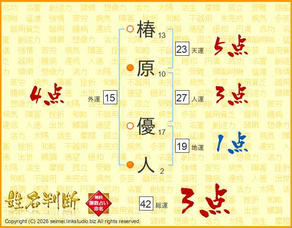 椿(13画)原(10画) 優(17画)人(2画)