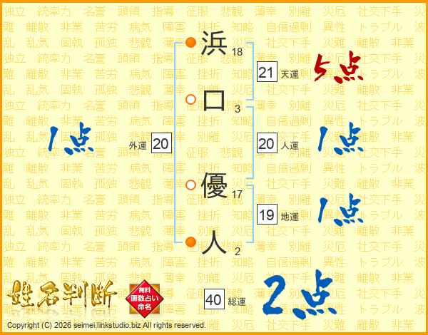 あなたの人生を表す1番重要な運勢です。生涯を通じて影響する総合運となり、主に50歳以降の晩年期に影響を及ぼします。苗字と名前の合計画数。