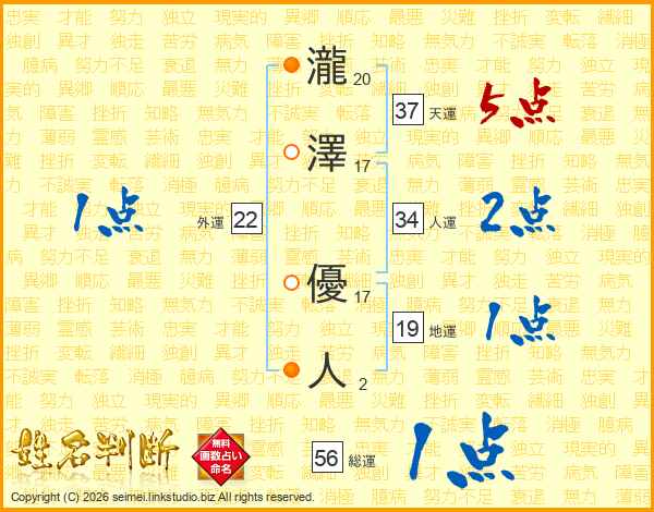 瀧(20画)澤(17画) 優(17画)人(2画)