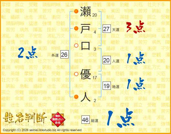 瀬戸口優人さんの人運は20画の1点!