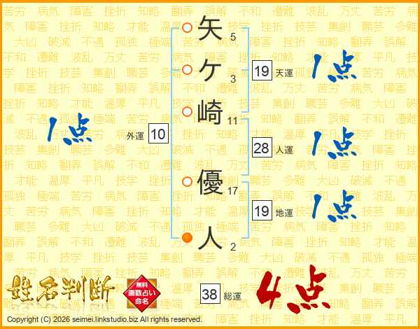 矢(5画)ケ(3画)崎(11画) 優(17画)人(2画)