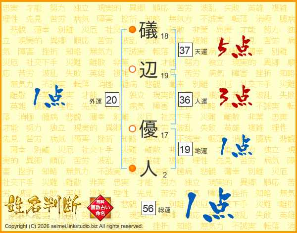 生活面を象徴する運勢です。外部から受ける影響力を表し、結婚運、家庭運や職場、環境への順応性を表します。総運から人運を引いた画数。姓や名が1文字の場合を除く。