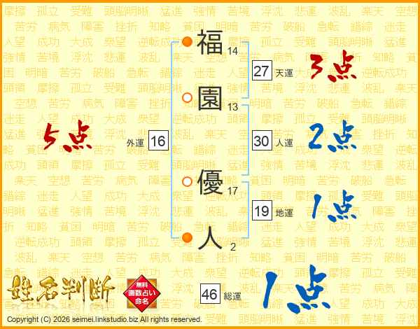 生活面を象徴する運勢です。外部から受ける影響力を表し、結婚運、家庭運や職場、環境への順応性を表します。総運から人運を引いた画数。姓や名が1文字の場合を除く。