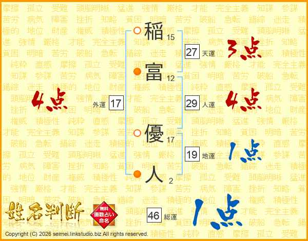 稲(15画)富(12画) 優(17画)人(2画)