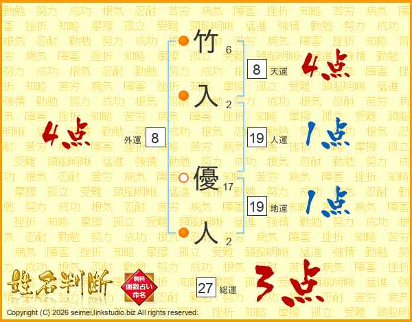 生活面を象徴する運勢です。外部から受ける影響力を表し、結婚運、家庭運や職場、環境への順応性を表します。総運から人運を引いた画数。姓や名が1文字の場合を除く。
