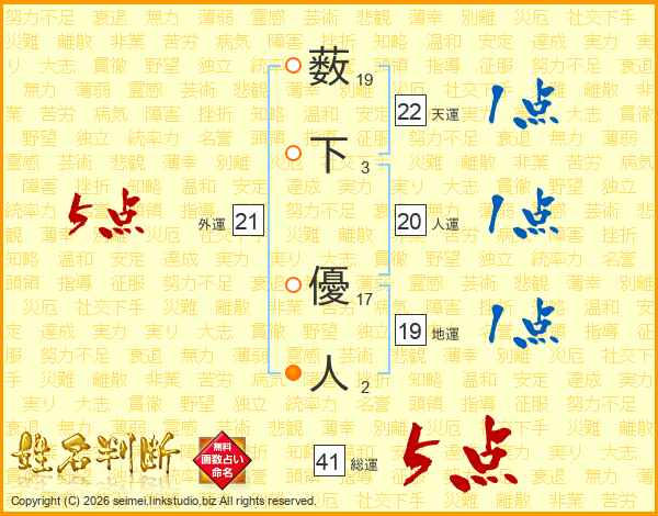薮下優人さんの総運は41画の5点!