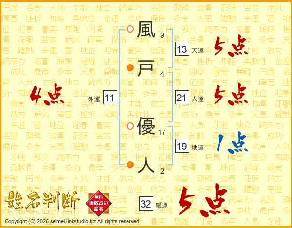 風戸優人さんの総運は32画の5点!