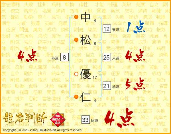 中(4画)松(8画) 優(17画)仁(4画)