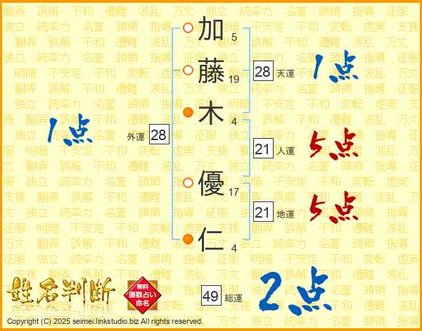 加藤木優仁さんの人運は21画の5点!