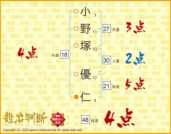 小(3画)野(11画)塚(13画) 優(17画)仁(4画)