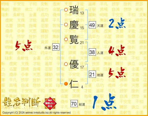瑞(13画)慶(15画)覧(21画) 優(17画)仁(4画)