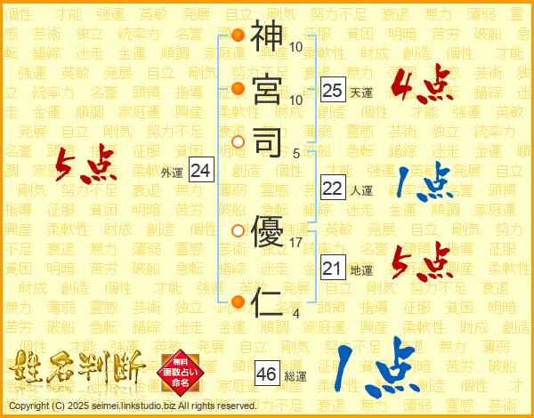 神(10画)宮(10画)司(5画) 優(17画)仁(4画)