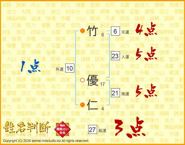 竹(6画) 優(17画)仁(4画)