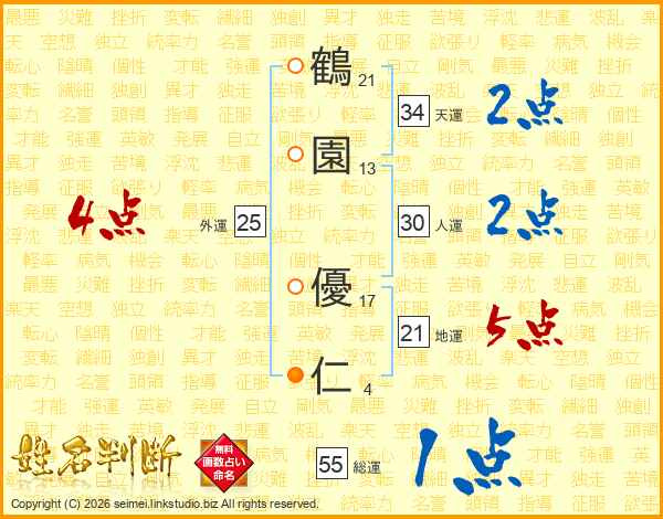 鶴(21画)園(13画) 優(17画)仁(4画)