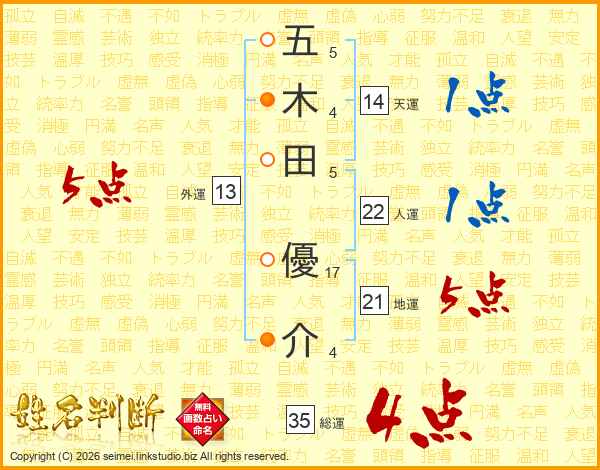 五(5画)木(4画)田(5画) 優(17画)介(4画)