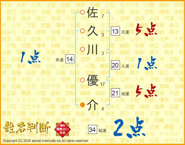 佐久川優介さんの総運は34画の2点!
