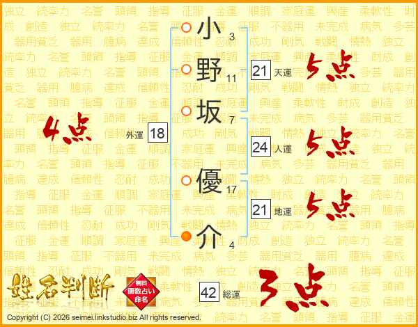 小(3画)野(11画)坂(7画) 優(17画)介(4画)