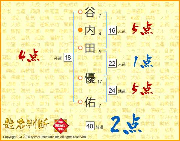 谷(7画)内(4画)田(5画) 優(17画)佑(7画)