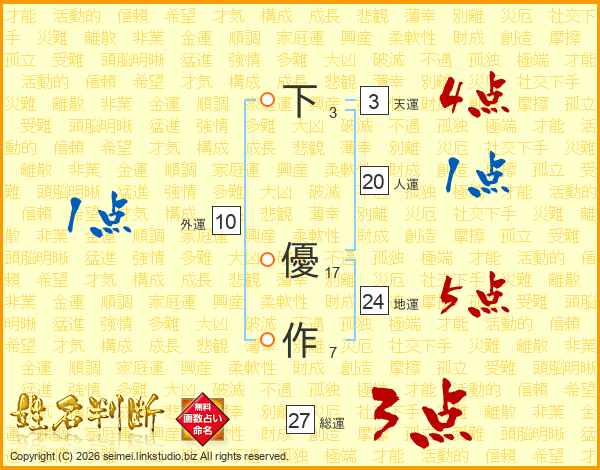 生活面を象徴する運勢です。外部から受ける影響力を表し、結婚運、家庭運や職場、環境への順応性を表します。総運から人運を引いた画数。姓や名が1文字の場合を除く。