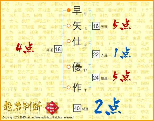 早(6画)矢(5画)仕(5画) 優(17画)作(7画)