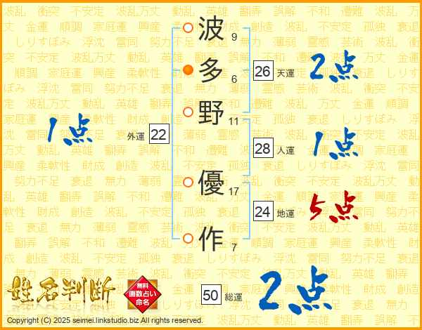 波(9画)多(6画)野(11画) 優(17画)作(7画)