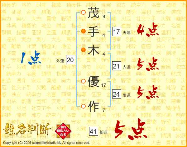 茂(9画)手(4画)木(4画) 優(17画)作(7画)