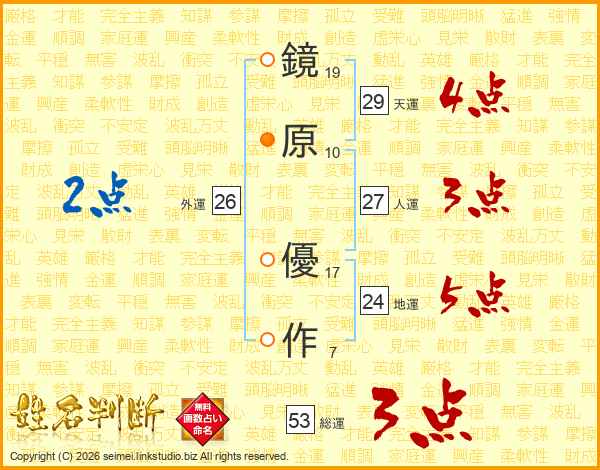鏡(19画)原(10画) 優(17画)作(7画)